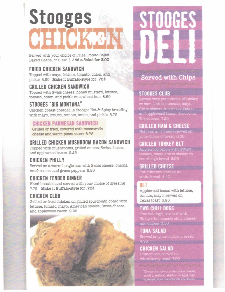 Chicken breast breaded in stooges hot and spicy breading with mayo, lettuce, tomato, onion, and pickle spear.
