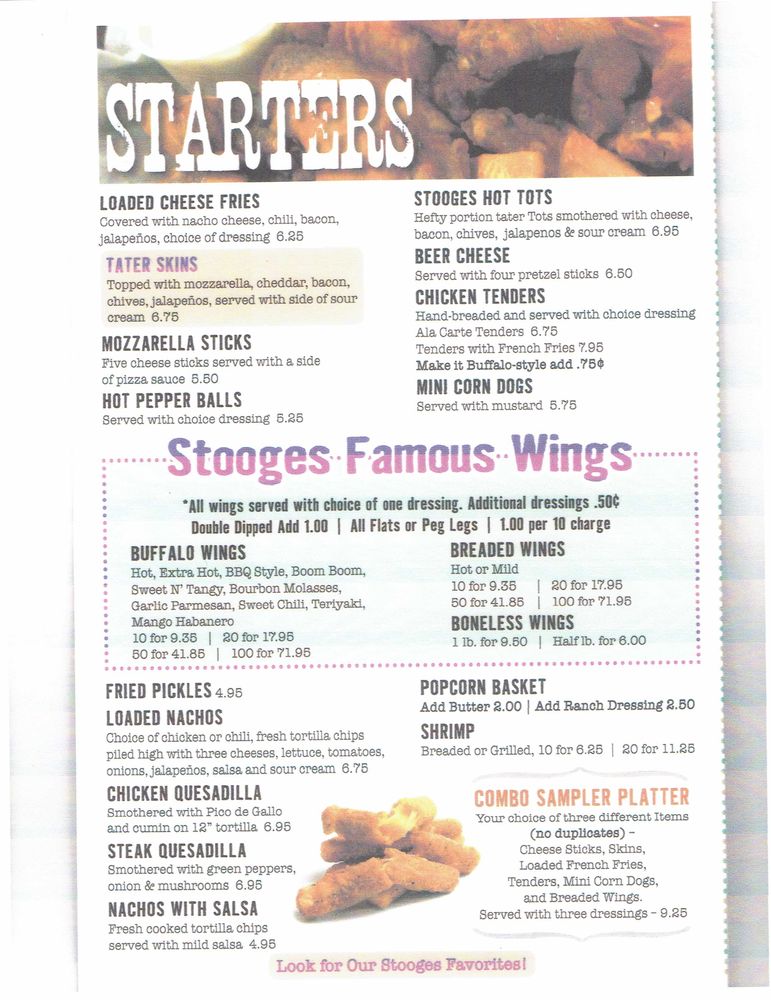 Stooges Bar & Grill is a lively spot in Louisville, KY known for its diverse menu featuring starters like loaded cheese fries, tater skins, and chicken tenders. The Stooges Salad options cater to different tastes, with highlights such as the grilled chicken salad and shrimp salad. The soup selection includes chili and soup of the day, both made in-house. Customers praise the friendly service and the vibrant sports bar atmosphere, with plenty of TVs for watching games. The wings are a standout dish, with patrons raving about their size and flavor. Stooges Bar & Grill is a popular choice for a casual night out with friends or for catching a game, offering a relaxed and welcoming environment.